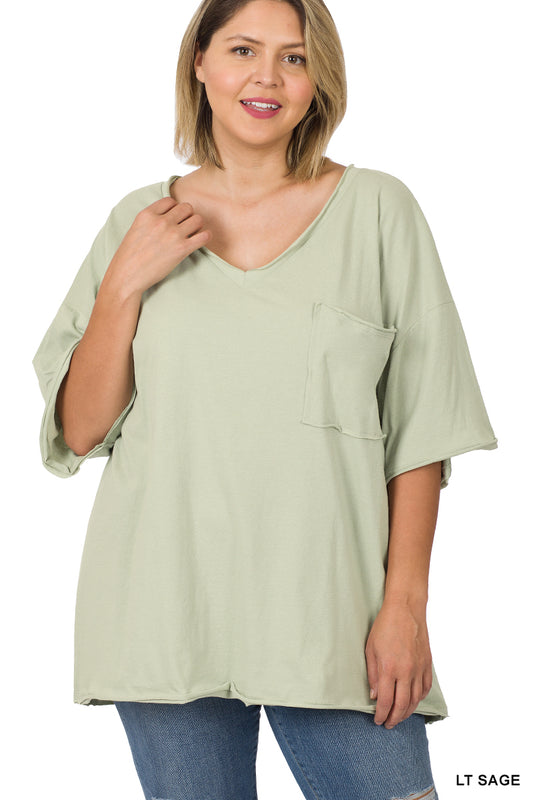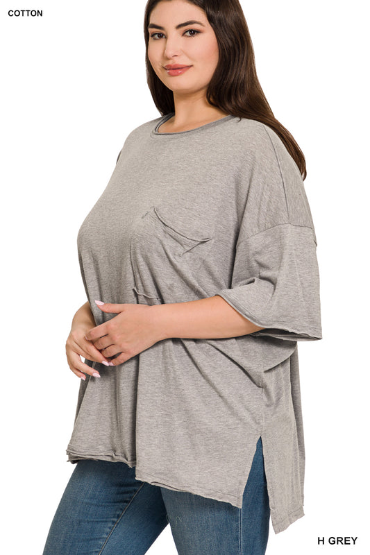 PLUS OVERSIZED FRONT POCKET RAW EDGE BOYFRIEND TEE