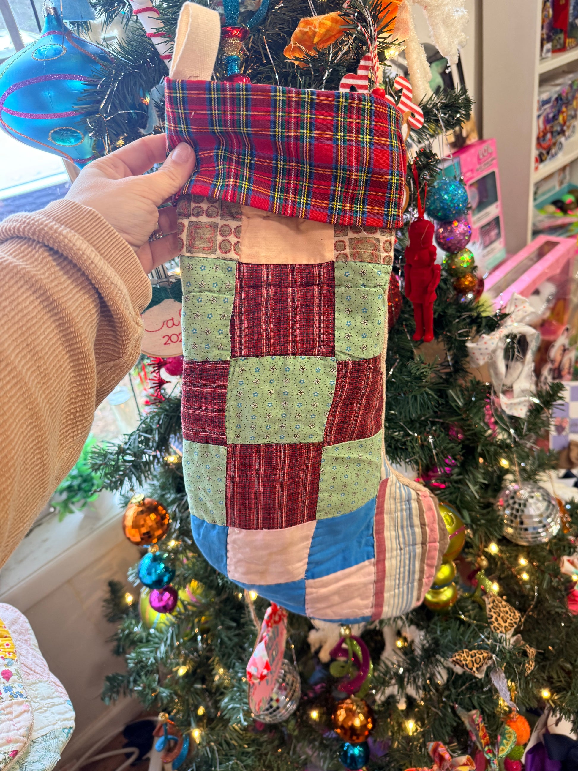 Our quilts lived long, loved lives before becoming stockings. Minor wear, small tears, soft fraying, or gentle time stains may be visible — these details only enhance the personality and charm of each piece.